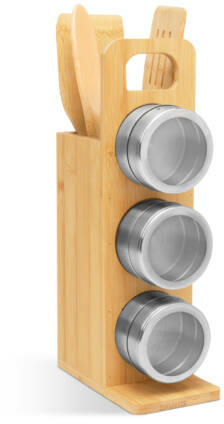 Természetes, bambusz anyagból készült konyhai eszköz -és fűszertartó. A tartó elején található mágnesek rögzítik a 3 db átlátszó fedéllel rendelkező fűszertartót. A tartók teteje levehető vagy eltekerhető, így az oldalán lévő nyílásokon keresztül könnyen hozzáférhet és adagolhatja a szükséges mennyiségű fűszert. A bambuszból készült konyhai lapát, spatula és fakanál nélkülözhetetlen kellékei a hatékony és gyors főzésnek.