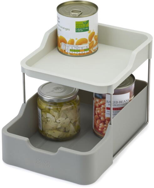 A kétszintes Joseph Joseph állvány hatékonyabb élelmiszer-tárolást biztosít. A felső polc befőttesüvegek vagy konzervdobozok elhelyezésére alkalmas. Az alsó rész kihúzható, így kisebb dobozok vagy tubusos élelmiszerek tárolásához ideális. Jó tudni: Az állványt olyan szekrényekhez tervezték, amelyek belső mélysége legalább 26,5 cm.