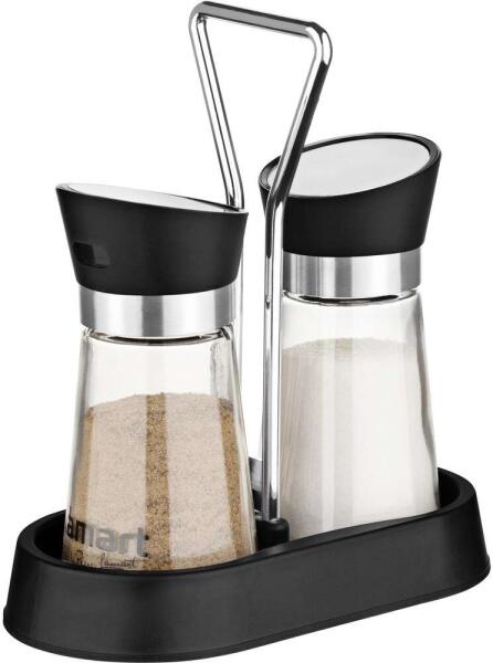 Lamart ízesítős szett: Elegáns só- és borsőrlő dupla készlet Ez a stílusos Lamart ízesítős szett tökéletes választás a modern konyhákba. Két darab elegáns, üveg só- és borsőrlőt tartalmaz, melyek rozsdamentes acél és fekete műanyag elemekkel vannak kombinálva. A praktikus állványnak köszönhetően mindig kéznél lesznek az ízesítőid. ✨ Főbb jellemzők:Elegáns design: A fekete és ezüst színkombinációja modern és letisztult megjelenést kölcsönöz. Két darab 95 ml-es üveg tartály: Bőséges hely a sónak és borsnak. ? Rozsdamentes acél és üveg kombináció: Strapabíró és könnyen tisztítható anyagok. Praktikus állvány: A két tartály kényelmesen tárolható és szállítható. Könnyű használat: A rozsdamentes acél fedél elfordításával könnyen nyitható és zárható a tartály. Használat: A műanyag részeket kézzel mosd el. ? Az üvegtermékekkel bánj óvatosan! ⚠️ Tökéletes választás: Otthoni és éttermi használatra egyaránt alkalmas ez a stílusos és praktikus ízesítős szett. A modern dizájn és a kiváló minőségű anyagok garantálják a hosszú élettartamot.