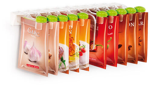 Kiválóan alkalmas az ételek ízesítésére egyenesen a fűszereszacskóból, valamint a fűszerestasakok lezárására a tárolásnál. A felfüggeszthető listán lévő fűszerek a konyhaszekrényben egyenként is kivehetők, de levehető mind a 10 tasak is egyszerre a felfüggeszthető listával együtt. 3 különböző nagyságú szórónyílással rendelkeznek az egész, őrölt és finomra őrölt fűszerek kényelmes adagolása érdekében. Első osztályú ellenálló műanyagból készült, mosogatógépben is mosható. 3 éves garancia.
