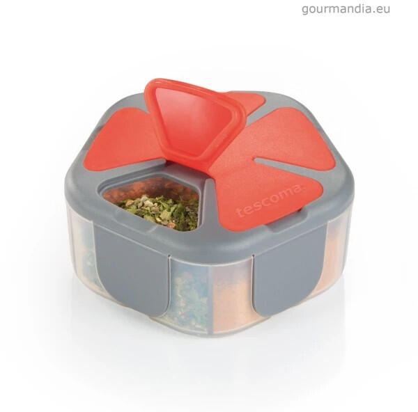 Kompakt fűszertartó akár 5 fajta fűszer elválasztott tárolásához, pontos adagolásához és a helytakarékosság megőrzéséhez.